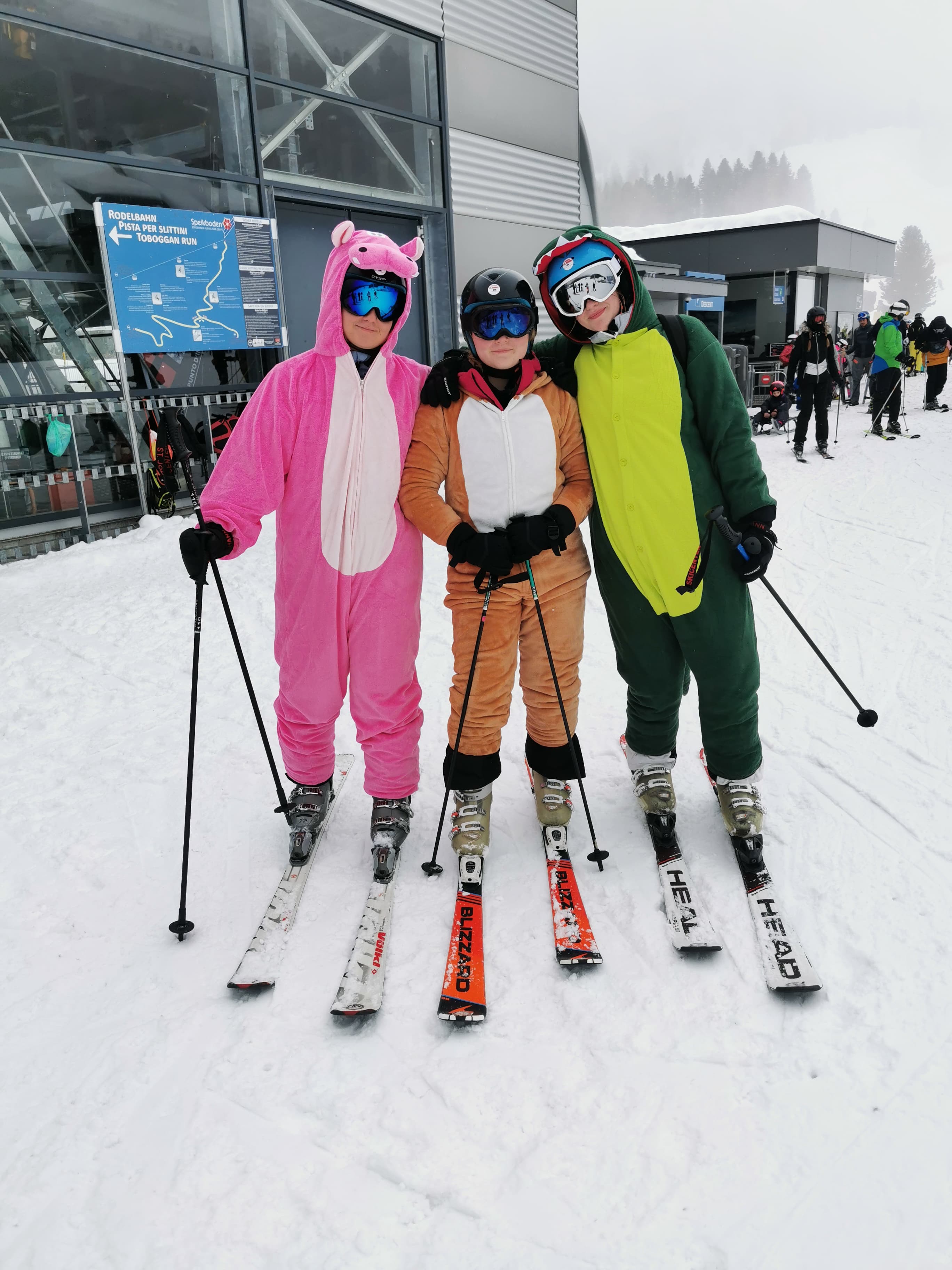 Nach der Pause klarte es auf und der höchste Gipfel des Skigebiets war wieder zu sehen. Das war genau der richtige Zeitpunkt, um mit den Fortgeschrittenen ganz nach oben zu fahren und die lange weite Abfahrt zu genießen. Auch das letzte schwarze Stück der Piste meisterten alle kontrolliert und problemlos. An den blauen Pisten wurde weiter mit großer Motivation geübt. Am Ende des Tages konnten bereits drei der Anfänger durch den Wald zurück zur „Almdiele“ fahren. Nach dem wie immer hervorragenden Abendessen stand noch eine Runde „Aktivity“ an.